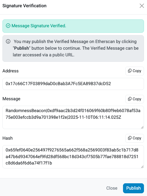 signerin the Address field. Thesigneris a signing addresses derived from the TEE mnemonic.messagein the Message field.signaturein the Signature Hash field.